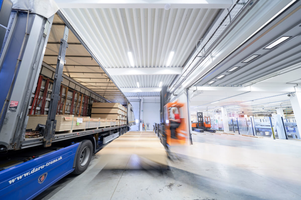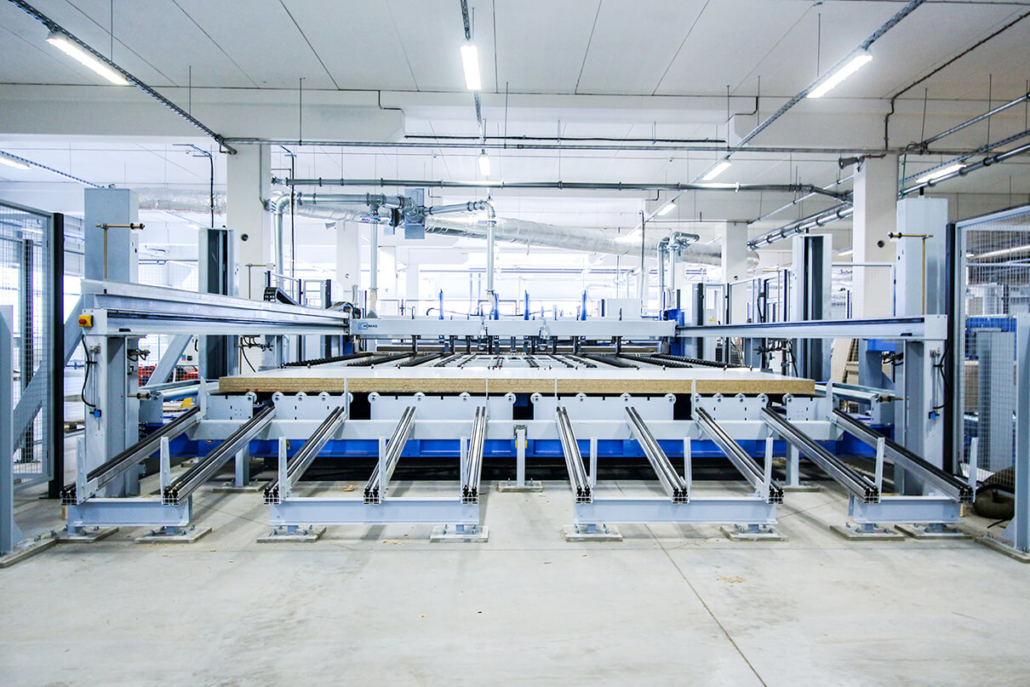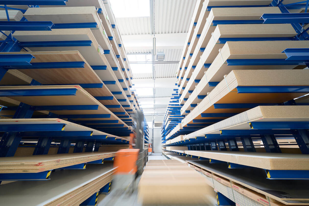 - Hochregallager für Plattenwerkstoffe mit vollautautomatischer, verschnittoptimierter Plattenaufteilsäge