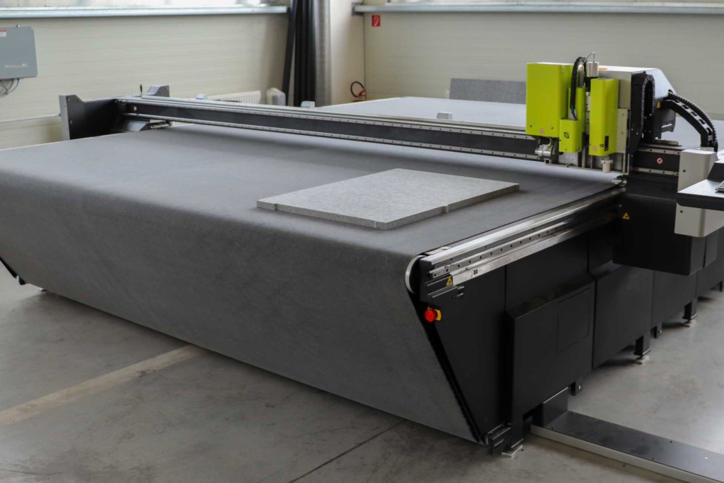 - hochmoderne Filzschneidemaschine mit folgenden Bearbeitungsmöglichkeiten: schneiden, falzen und fräsen.